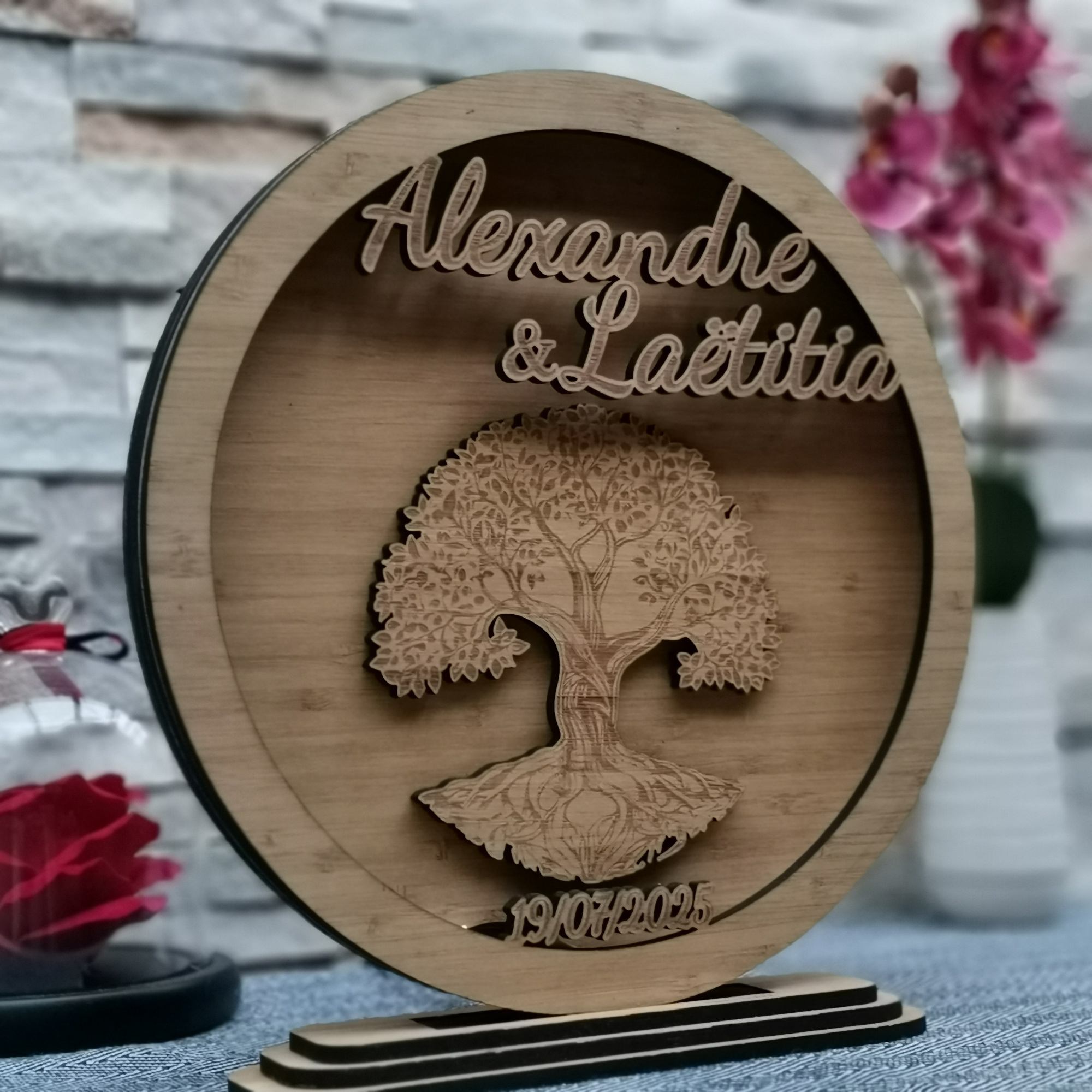 Illuminez votre union avec une pièce unique qui vous ressemble. Cette lampe « Arbre de Vie » personnalisée n’est pas qu’un simple luminaire : c’est le symbole de vos racines communes et de l’amour qui grandit jour après jour. Gravée avec vos prénoms et la date de votre mariage, elle apporte une touche naturelle et poétique à votre décoration de salle ou à votre intérieur.