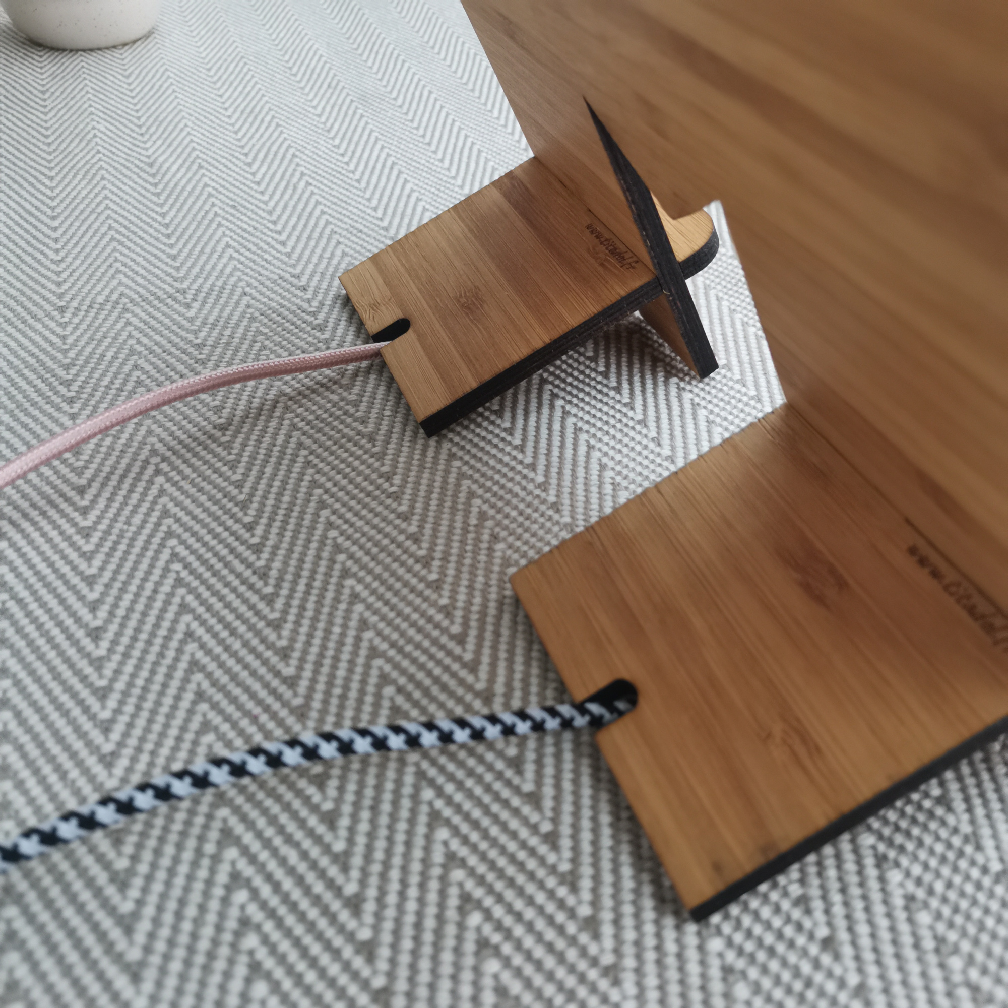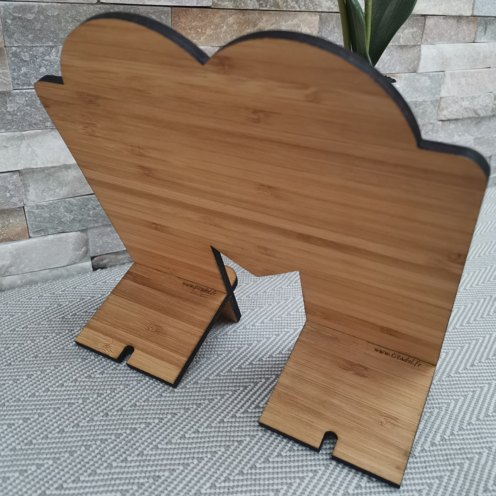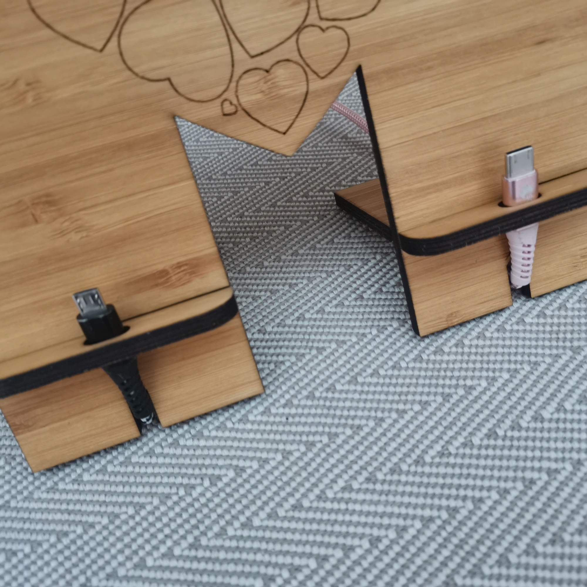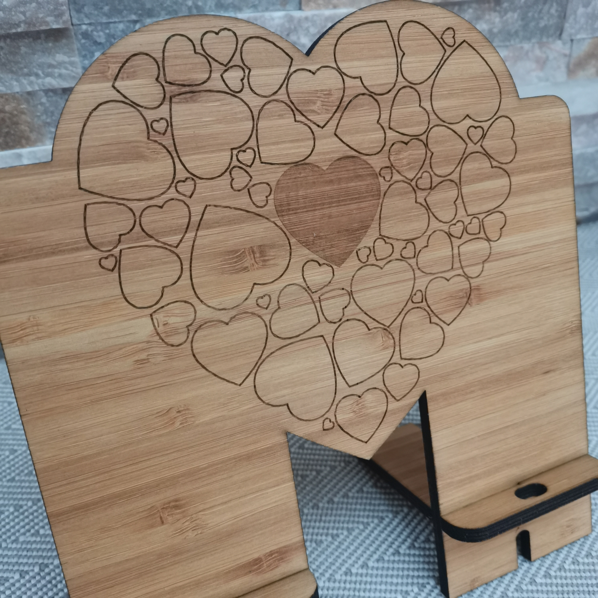 Support téléphones duo en contreplaqué de bambou, pensé pour les couples. Deux emplacements permettent de poser deux smartphones côte à côte. Le motif cœur composé de petits cœurs symbolise l’amour et la complicité. Idéal comme cadeau romantique pour la Saint-Valentin, un anniversaire de couple, un mariage ou un cadeau de fiançailles.